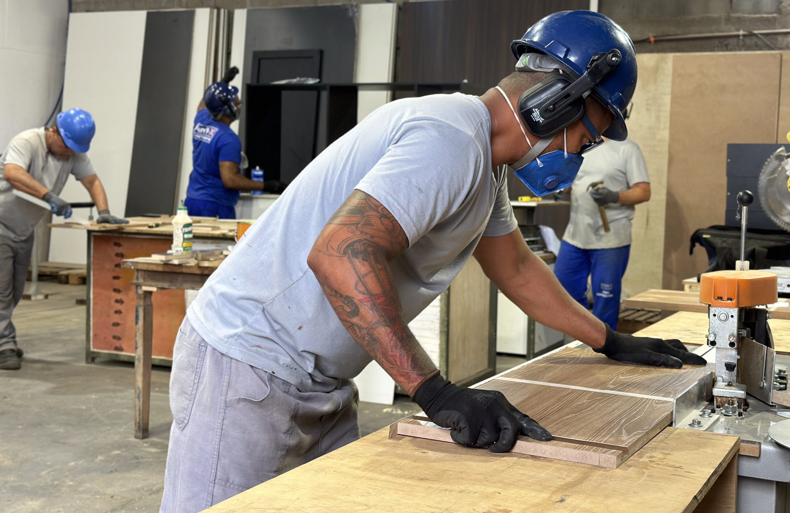 A marcenaria funciona em sintonia com outros setores, como o centro de distribuição e a serralheria de alumínio e vidro, ajudando a organizar, produzir e transportar materiais de forma mais rápida e eficiente. Essa colaboração entre os setores permite que os projetos avancem sem interrupções e com o máximo de qualidade, desde a produção até a instalação final.